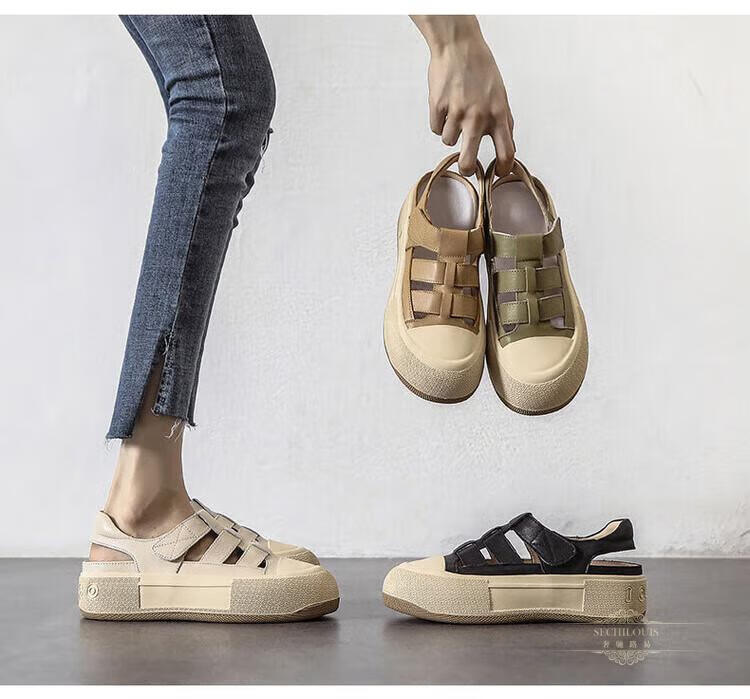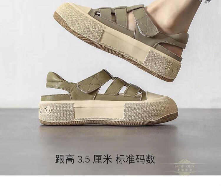 商品名称:奢驰路易(SECHILOUIS)包头凉鞋女2023夏季新款皮复古罗马鞋透气镂空洞洞休闲板鞋女 绿色 36