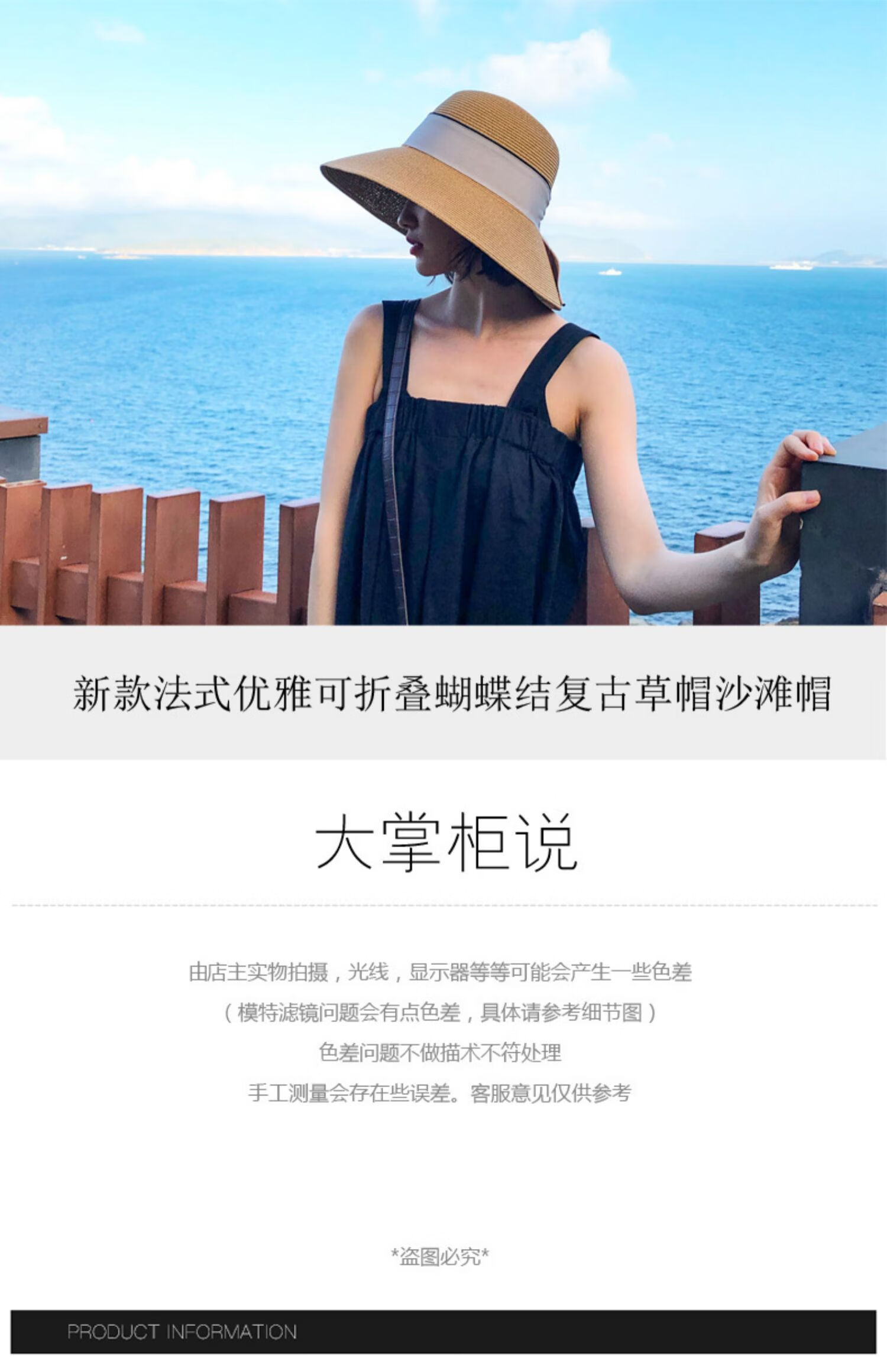 商品名称:氧绘ins款草帽女夏季可折叠沙滩帽遮脸遮阳帽蝴蝶结渔夫帽太阳帽盆帽 卡其配黑色带(嵌咖啡色条) 均码(可调节配防风绳)