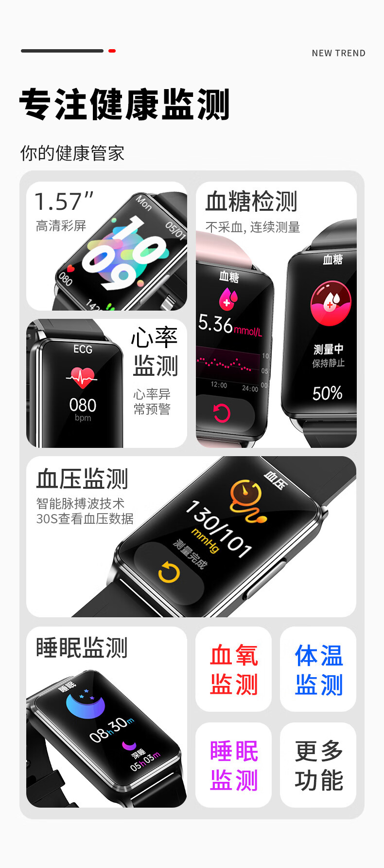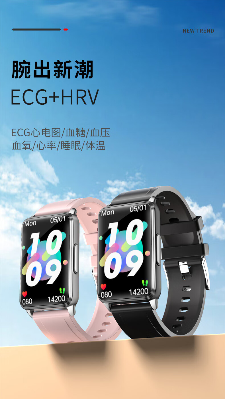 商品名称:无创血糖免采血健康智能手环心电图脉搏血压血氧体温心率报警体温老人多功能运动睡眠监测仪男女ADZ 腕表 尊贵黑